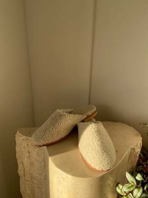 This is Mina - A comfortable version of a classic slipper! Each pair of slippers is handmade from ethical sheepskin and has a thick leather sole allowing you to wear this piece inside or outside. Each model is unique and the color / texture of sheepskin may vary slightly due to the nature of this material. Rounded toe Padded insole Sheepskin stems Leather soles This item is normal. It is suitable for half sizes. Handmade in Morocco.