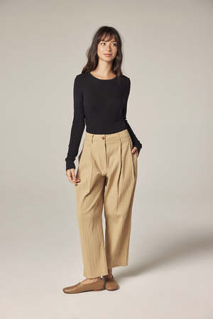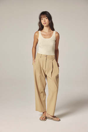 Relaxed tailoring meets everyday comfort in these elastic-back cotton pants. Designed with a softly structured silhouette, the front pleats create a refined shape while allowing ease of movement. The elastic waistband at the back offers a flexible, comfortable fit without compromising the clean look of the front. Crafted from lightweight textured cotton, the fabric feels breathable and natural against the skin, making these pants ideal for everyday wear across seasons. The straight, slightly cropped leg gives the style a modern, effortless balance that pairs easily with both casual and more polished pieces. DETAILS - Elastic back waistband for comfort - Front pleats for a relaxed, tailored shape - Straight, slightly cropped leg - Side pockets - Textured cotton fabric SIZE AND FIT Model is 5'7" with measurements 32-23-34, wearing a size S. Approximate measurements based on flat fit: - S: Outseam 37 1/2"; Waist 14 1/2"; Hip 19" - M: Outseam 38"; Waist 15 1/2"; Hip 20" - L: Outseam 38 1/2"; Waist 16 1/2"; Hip 21" WASHING INSTRUCTIONS - Machine wash delicate - Do not bleach - Dry flat - Medium temperature iron - Professional dry cleaning if necessary