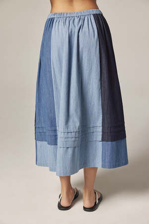 A relaxed midi skirt crafted from 100% cotton, designed with softly contrasting denim tones. The elastic waistband offers effortless comfort, while the gathered volume creates a natural, easy drape. Subtle horizontal stitch details near the hem add quiet structure, and the layered color blocking gives depth without overpowering. Lightweight yet substantial, it moves gently with every step. Details - 100% cotton - Elastic waistband - Midi length - Contrast panel design - Soft gathered silhouette Size and fit Model is 5'7" with measurements 32-23-34 and is wearing a size XS/S. Approximate measurements based on flat fit: - XS/S: Length 31 1/2", Waist 13 1/2", Sweep 36 1/4" - M/L: Length 32", Waist 14 1/2", Sweep 37 1/4" Washing instructions - Machine wash delicate - Do not bleach - Dry flat - Iron steam or dry with low heat - Dry clean if necessary.