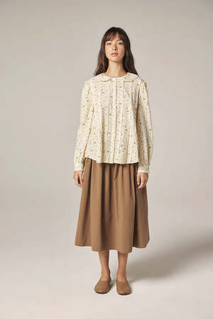 A gentle, refined shirt for the soft moments of transitional dressing. Crafted in lightweight, breathable cotton, this relaxed-fit button-down features a signature Peter Pan collar edged with delicate lace, evoking quiet romance and thoughtful simplicity. A muted floral print in warm yellow and olive tones dances across the ivory ground, lending a subtle, artisan touch to everyday wear. Thoughtfully detailed with tonal buttons and gentle pintucks at the front, the silhouette falls with easy grace both tucked and untucked. Eyelet embroidery and lace insets across the bodice and back yoke offer a vintage-inspired charm without excess, making this shirt both poetic and poised. - Soft Peter Pan collar with lace trim - Full button placket with tonal buttons - Lightweight cotton for breathable comfort - Mini floral motif in warm, earthy tones - Eyelet embroidery and lace panel accents - Relaxed silhouette with subtle shaping SIZE AND FIT Model size: 5'7" 32-23-34, wearing a size XS/S. Approximate measurements based on flat fit: - XS/S Length: 25 1/4"; Chest: 21 1/2"; Sleeve length: 23 1/4" - M/L Length: 25 3/4"; Chest: 22 1/2"; Sleeve length: 23 3/4" WASHING INSTRUCTIONS - Machine wash delicate - Do not bleach - Dry flat - Medium temperature - Professional dry cleaning if necessary