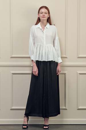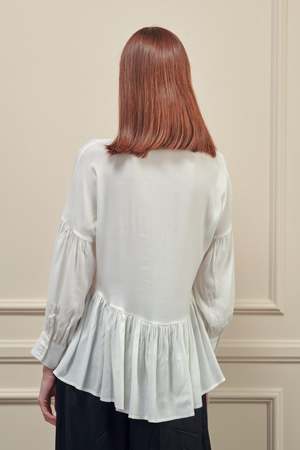 Tencel high and low button-down shirts featured in an oversized and comfortable silhouette. dropped long-sleeves, and shrring details. SIZE AND FIT Approximate measurement on size S Fit: Measured flat. Length: 25~28" Chest: 19" Sleeve LT: 24" WASHING INSTRUCTIONS: Hand wash cold with like colors (and ideally a full load the eco way) Do not bleach, Tumble dry low if necessary, cool iron if necessary, Professional Dry Cleaning if necessary