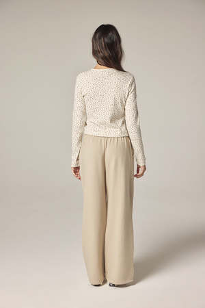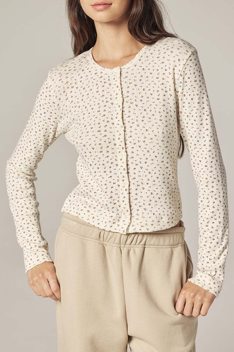 A delicate essential designed for light layering. The Button Down Short Cardigan is crafted from a soft cotton with a subtle rib texture and gentle stretch, offering a comfortable, close-to-body fit. Finished with a classic round neckline, petite buttons, and a slightly cropped silhouette, it brings quiet charm to everyday dressing. The delicate floral print adds a soft, romantic touch, making it easy to pair with relaxed trousers or skirts, or to wear open over simple tees. An effortless pre-spring staplelight, feminine, and quietly timeless. Size and Fit Model size: 5'7" 32-23-34, wearing a size XS/S. Approximate measurements based on flat fit. Washing Instructions - Hand wash cold - Do not bleach - Dry flat - Warm iron if necessary - Professional dry cleaning if necessary