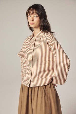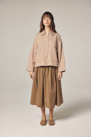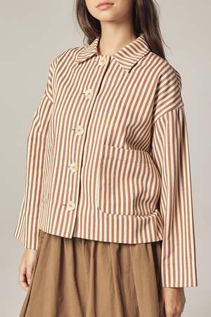 A lightweight layer with a clean, graphic finish. This jacket is crafted from pure cotton with a vertical stripe pattern, offering a structured yet relaxed silhouette. Designed with a classic collar, button-down front, and patch pockets, it works effortlessly as a transitional outer layer or a standalone piece. - Pure cotton with striped weave - Button-down front closure - Classic collar and patch pockets - Relaxed fit for everyday layering SIZE AND FIT Model size: 5'7" 32-23-34, wearing a size XS/S. Approximate measurements based on flat fit: - XS/S Length: 22 5/8" Chest: 22 3/4" Sleeve length: 19 3/8" - M/L Length: 23 1/8" Chest: 23 3/4" Sleeve length: 19 3/4" WASHING INSTRUCTIONS: - Machine wash delicate - Do not bleach - Dry flat - Medium temperature - Professional dry cleaning, if necessary
