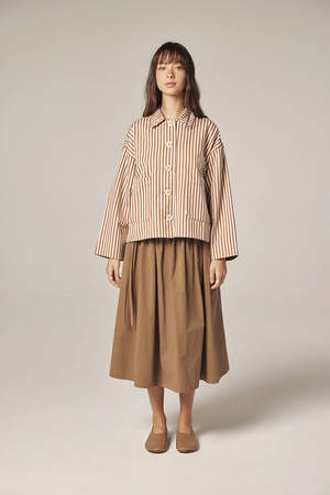 A lightweight layer with a clean, graphic finish. This jacket is crafted from pure cotton with a vertical stripe pattern, offering a structured yet relaxed silhouette. Designed with a classic collar, button-down front, and patch pockets, it works effortlessly as a transitional outer layer or a standalone piece. - Pure cotton with striped weave - Button-down front closure - Classic collar and patch pockets - Relaxed fit for everyday layering SIZE AND FIT Model size: 5' 7" - 32-23-34, wearing a size XS/S Approximate measurements based on flat fit. - XS/S - LT: 22 5/8" Chest: 22 3/4" Sleeve LT: 19 3/8" - M/L - LT: 23 1/8" Chest: 23 3/4" Sleeve LT: 19 3/4" WASHING INSTRUCTIONS: - Machine wash delicate - Do not bleach - Dry flat - Iron at medium temperature - Professional dry cleaning, if necessary