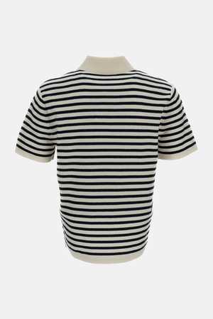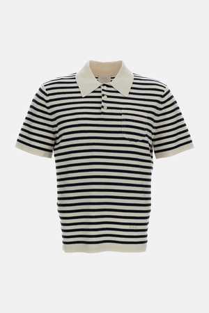 Men > Clothing > Topwear > T-Shirts Cotton-blend polo shirt in ecru with dark blue stripes. Classic polo collar with three-button placket. Chest patch pocket. Ribbed hem and cuffs. Color: Ecru/Dark Blue Composition: 85% Cotton, 15% Cashmere.