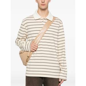Men > Clothing > Topwear > Polo Shirts A beige striped polo shirt with long sleeves and a classic collar.