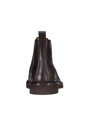 A.P.C.'s Grisha Chelsea Boots are made from smooth leather from Portugual, where they were also produced. - Rounded tip - Ankle high - Large elasticated tone-on-tone side gore on both sides - Leather pull tab on back - Lined in reversed sheepskin with suede leather at heel - Insole reinforced at heel - Crepe outsole - Topstitched welt - 100% Cowhide leather