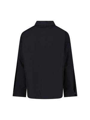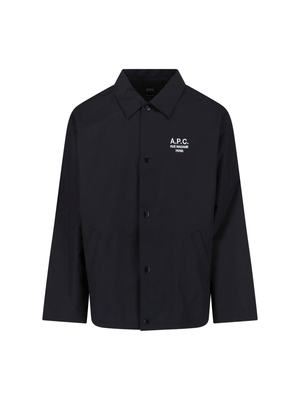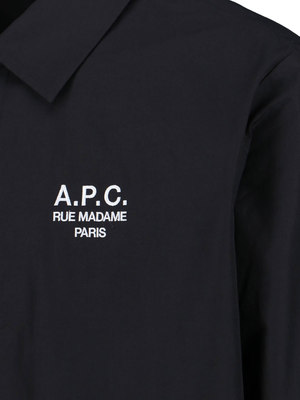 Men > Clothing > Coats & Jackets A.P.C. "Regis" jacket in black fabric with classic collar, front button closure, long sleeves, contrasting printed logo2 on the front, button cuffs, and a straight hem. Composition: 60% Polyester, 40% Cotton.
