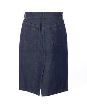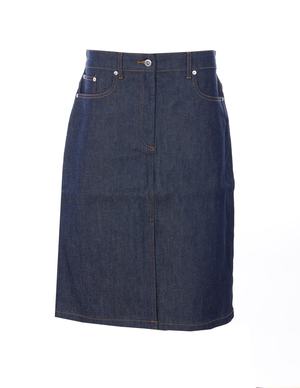 Women > Clothing > Skirts A.P.C. denim midi skirt with zip and button closure, pockets, and a back slit. Composition: 98% Cotton, 2% Polyurethane.