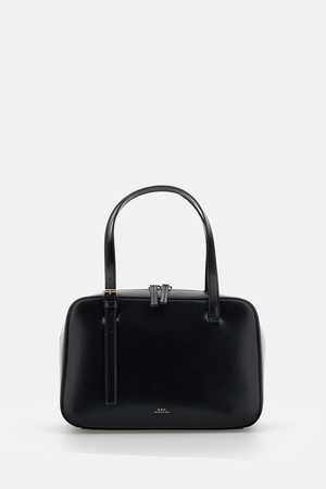 Women > Bags > Shoulder Bags Smooth leather handbag with dual adjustable handles and gold-tone metal buckles. Can be carried by hand or on the shoulder. Features dual leather zip-pull closure, one internal pocket, and a gold-tone embossed "A. P. C. Rue Madame Paris" logo2. Color: Black Composition: 100% Cow Leather.
