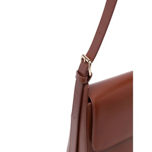 Women > Bags > Shoulder Bags Brown calf leather shoulder bag with a smooth grain trapeze body, adjustable shoulder strap, logo2 print at the front, slip pocket at the rear, main compartment with internal logo2 patch and internal patch pocket, canvas lining, and a foldover top with magnetic fastening. This piece comes complete with a protective dust bag.