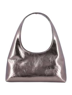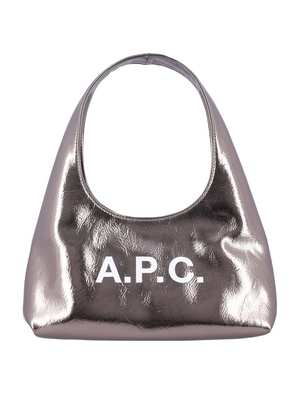 Women > Bags > Shoulder Bags Baby Ninon Shoulder Bag by A.P.C. featuring metallized eco leather, magnetic closure, top handles, logo2 print at front, and inner flat pocket. Height: 13.5 cm Width: 26 cm Depth: 10 cm Composition: 88% polyurethane, 8% wood, 4% other fibres.