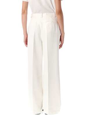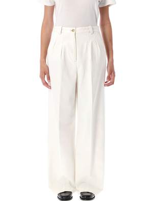 Women > Clothing > Jeans The Tressie Denim Chino Trousers by A.P.C. are made from 100% cotton. They feature a high-rise waist, button and zip fly closure, front pleats, side pockets, a back welt pocket, and a wide leg with permanent creases at the front and back. Model is 1.70 m and wears size 36.