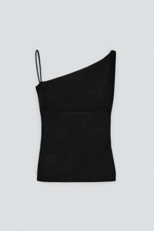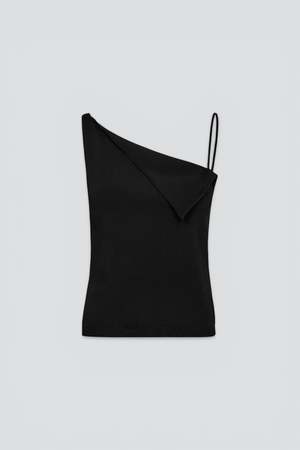 The Trine Top from A. Roege Hove is a technical knit tank featuring two asymmetrical tie straps and a draped neckline. - 83% FSC Viscose / 17% Polyester Type: Top