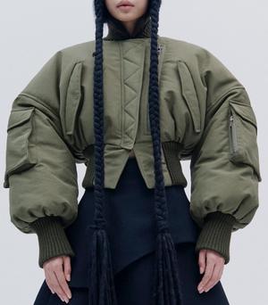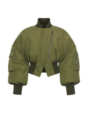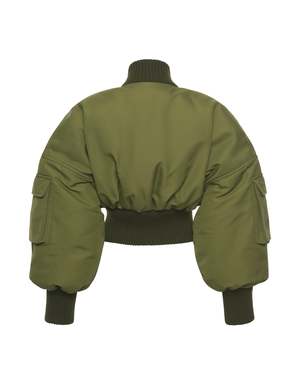 The MA1 Bomber Jacket by A.W.A.K.E. MODE is a cropped bomber with puffed sleeves and a corseted waist hem for a fashion-forward silhouette. Pockets on the arms and front add practicality without sacrificing style. Color: Khaki Green Care Professional dry clean only. Fit Take your true size. A.W.A.K.E. Mode Euro to US sizing: 38 = 2, 40 = 4, 42 = 6, 44 = 8, 46 = 10. Details Outer: 64% Polyamide, 36% Cotton Lining: 65% Polyester, 35% Cotton.
