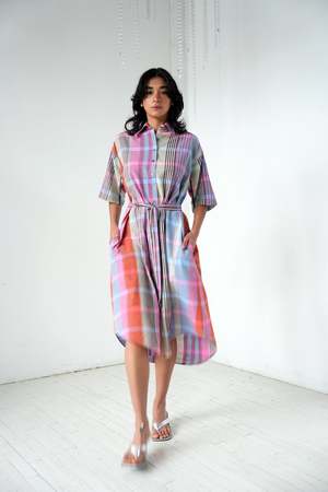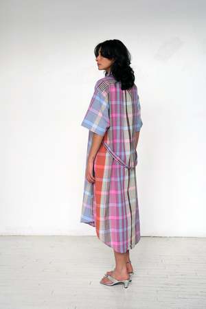 The Shani Plaid Shirtdress by Abacaxi is a breezy, loose, long shirtdress designed for year-round wear and layering. It features short sleeves, natural shell buttons, and an optional waist tie, making it versatile and accommodating in humid, hot climates. Custom woven in Tamil Nadu and cut and sewn in Delhi, India in a limited batch.
