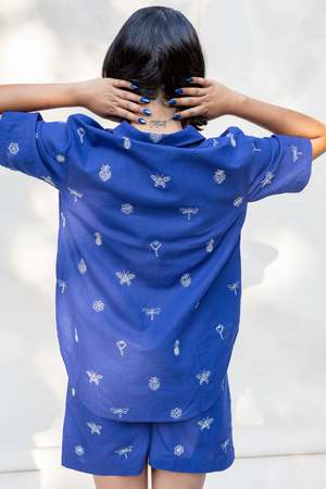 Effortless, loose fitting cotton-linen blend shorts with a narda (drawstring) tie at the waist. Dragonflies, berries, butterflies and pineapples are hand-embroidered with Zari, a traditional Indian technique that involves metal threads. Wear it with the matching button-down zari shirt for a versatile summer set, or with our Openwork Knit Sweater (coming in April). Made in Delhi, India in a limited edition.