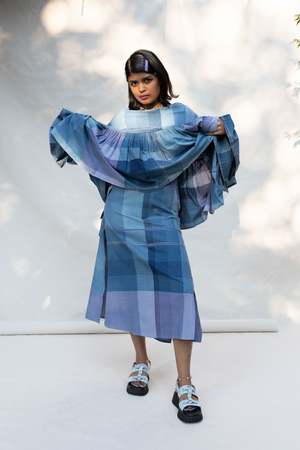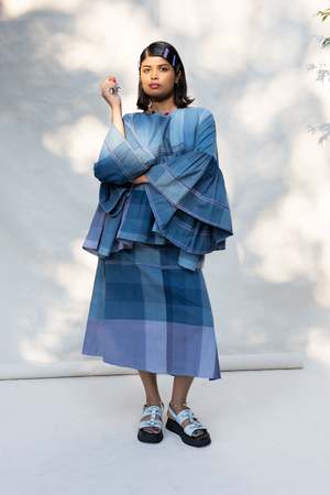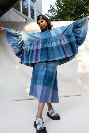 Mid-rise flared skirt inspired by 90's denim maxis. Featuring high side slits, three types of pockets, and a large flower-shaped natural shell button. Made with 100% organic cotton, hand-loomed and naturally dyed with indigo and vembadem in Tamil Nadu, India. Styled here with our Malini Blouse. Size up for a low-waisted moment or size down if you prefer a high waist fit. Each piece has a different placement on our custom color-blocked weave design, so yours may vary slightly from the one pictured here, making it all the more unique.