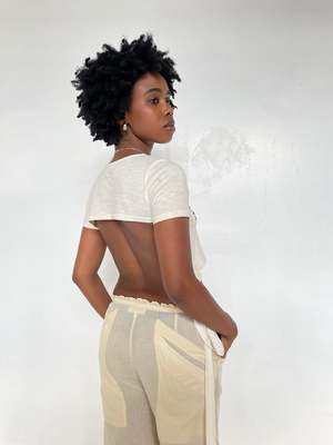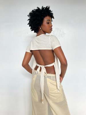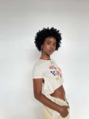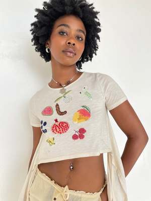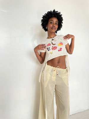 An updated version of our long sold-out signature Fruit Nostalgia Tee from 2020 is here! This sampler-style slub jersey backless tee features 9 different Indian fruits, each one embellished with a different hand beading or embroidery technique. Our new wrap tee has ties you can pull back for a more fitted look, or leave dangling (as shown on model here). Wooden beads at ends of ties. Can you name them all? Jamun, guava, tamarind, sitafal, amla, mango, litchi, pomegranate, and carambola!