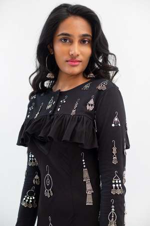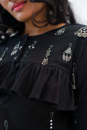 Long-sleeve hand-beaded shrug with shell button closure at the front so you can wear it open or closed. So many ways to style this clever, 90's-inspired hand-beaded design; covered in silver earring-motifs. Made in a very limited edition in Delhi, India.