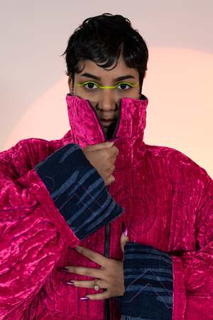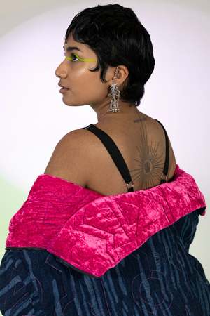 Think Pink! Our reversible quilted jacket is perfect for a dose of color therapy with hot pink velvet on one side, and the reversible design also allows you to wear our custom indigo-dyed jacquard fabric on the outside if you so choose. With a kimono-sleeve inspired shape, this one-size fits many (XS-2X) jacket has pockets on both sides. Two in the front and a hidden flap pouch pocket on the velvet back-side, perfect for carrying some essentials or a little snack :) Inspiration for the geometric quilting pattern that keeps both sides attached together, comes from the game of shoots and ladders from our youth.
