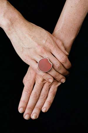 The Red Eclipse Ring from ABOAB is made from solid sterling silver and carnelian stone. This ring makes a bold statement but is extremely comfortable to wear. Featuring an adjustable band, this ring fits any hand. From the ETERNITY collectsion, revolving around the sun and the moon, which rise and set in an endless cycle. Inspired by Argentine artist Leandro Katz's moon poetry, this collectsion employs clay sculpture methods to depict the waxing and waning of the moon alongside sun-carving elements from ancient Egypt and Greek murals. Details: - Sterling silver and carnelian - Adjustable band - Stone diameter: 1 3/16" - Includes jewelry pouch, polishing cloth, and gift box