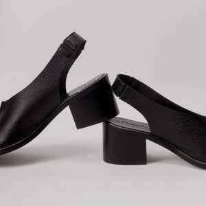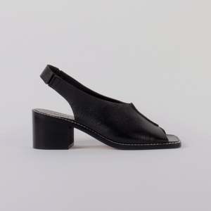 Block heel sling-back sandals made of black tumbled leather with raw edges. These sandals feature a wide toe strap with a central hem, a square wide toe, and a block heel. The sole is made of leather and has a welt with stitching details. Heel: 55 mm True to size Upper: 100% cow leather Rubber sole Made in Spain.