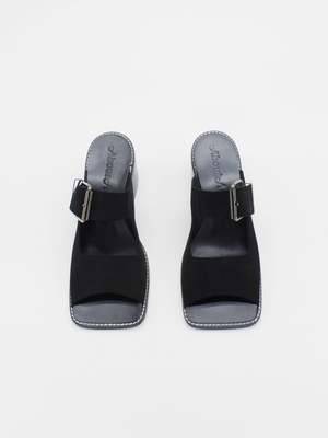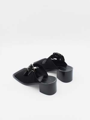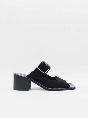 Block heel mules made of brown split-cow leather with raw edges and a resined interior. These sandals feature a wide toe strap with a metallic buckle, a square wide toe and a block heel. The sole is made of leather and has a welt with stitching details. - Heel approx 2" - Upper 100% cow leather - Rubber sole - Made in Spain Size fit True to size Title tag Avi Black