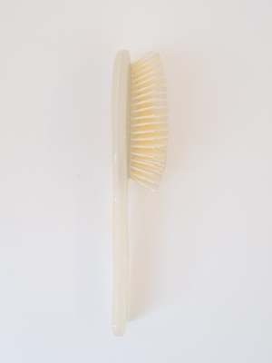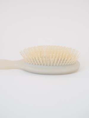 This oval brush is made from Bioacetate, a plant-based biodegradable, and recyclable material. Its natural rubber cushion holds extra-long pins, perfect for detangling and scalp massage. Suitable for all hair types, it works well on wet or dry hair. Materials: Bioacetate, 100% biodegradable and recyclable. Dimensions: 22.5 x 6.2cm. Care: Remove loose hair from pins, add a touch of shampoo to a bowl of lukewarm water and swirl, massaging the bristles with your fingers. Rinse and air dry.