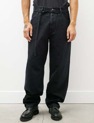A relaxed, 90s inspired mid rise jean cut from a washed 11oz indigo denim that has been over dyed to black to create rich fading at the seams and hems. Features classic five pocket denim styling with a right side ticket pocket, a leather logo2 patch at the waist, and a narrow d-ring self belt. Cut with a roomy seat and a subtle taper through the inseam, the leg falls away from the body from the hips to the ankle creating a relaxed, classic silhouette. Constructed with flat felled seams through the seat to improve durability at a region of frequent abrasion. Note: The waist is cut intentionally large and is meant to be cinched slightly using the included belt for a slouchy 90s look. Size down as per product measurements if a truer fit at the waist is desired. - Made in Italy - 100% cotton - Relaxed fit, straight leg - Machine wash - SASCHA IS 6', 180LBS AND WEARS SIZE 33