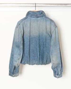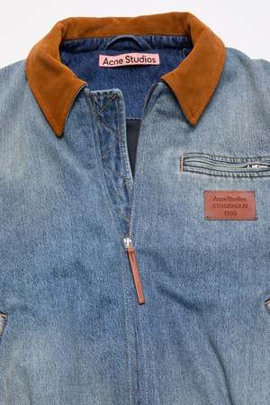 Modern utility meets elevated texture in this denim bomber jacket from Acne Studios. Crafted from organically grown cotton denim with subtle fading and whiskering, it blends relaxed structure with refined detailing for an effortlessly cool silhouette. - Faded finish with subtle whiskers for a lived-in effect - Suede collar adds contrast and tactile richness - Welt pockets with hidden zips for a clean, streamlined look - A gathered waist creates shape and balanced proportion - Logo leather patch at the chest for a discreet signature detail - Designed with comfort and movement in mind - Regular fit with a softly structured drape - The model is 5'10" and wears a size S - Sizing (US/Acne): S/36 Shell: 60% Cotton, 40% Lyocell. Lining: 100% Cotton. Filling: 100% Polyester. Patch & Collar: 100% Cow Leather. Made with organically grown cotton. Imported. FN-WN-OUTW001176