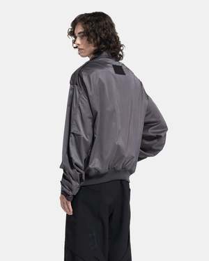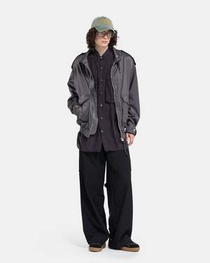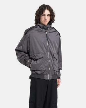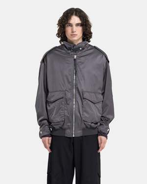 Acne Studios Satin Jacket in Mid Grey The Satin Jacket is crafted of a stretch cotton and viscose blend with a shimmering satin-like handfeel and drape. The jacket has an oversized, relaxed fit featuring darted sleeves and bodice with an elasticized rib-knit waistband. Details include snap adjustable epaulets, cuff guards, and cuff tabs. The convertible funnel collar has a cinch tab fastening. Beneath is a front zip, snap flapped pockets and side zip pockets. An embossed leather patch details the nape to complete. - 49% Cotton, 47% Viscose, 4% Elastane. - Made in Lithuania. - Dry clean. - FN-MN-OUTW001011. B90743 GOAT MID Kobe is 6'0 (183cm) and is wearing a size 46.