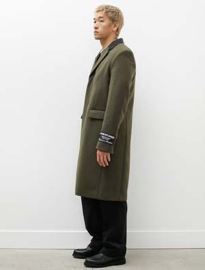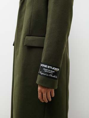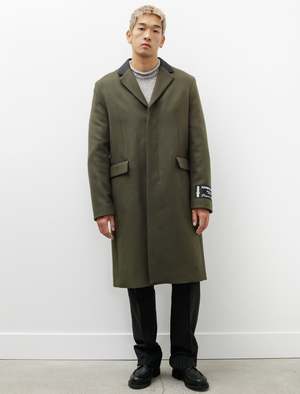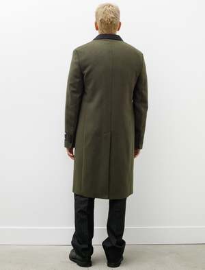 A roomy, elegant, darted dress coat cut from a heavy, dense wool melton in a deep olive green. Features a contrasting collar, a notch lapel with a high break point, a covered fly front placket, flapped welt pockets at the waist, functional surgeon's cuffs, and a hand stitched logo2 patch at the left wrist. Front darting creates subtle elegant shaping to provide a gentle flare through the silhouette with ample wearing ease provided by a generous rear vent pleat. Finished with a full lining in a black, jacquard logo2 satin complete with internal breast pockets. - Made in Romania - 80% wool, 20% nylon; contrast: 66% cotton, 34% viscose; lining: 50% viscose, 50% acetate - Relaxed fit - Dry clean only - SASCHA IS 6', 180 LBS AND WEARS SIZE 50