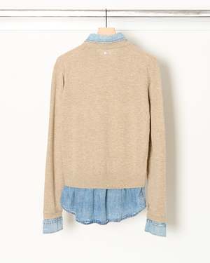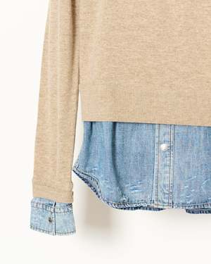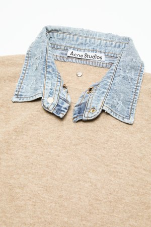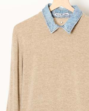 A modern play on layered dressing, this crewneck sweater from Acne Studios combines classic knitwear with a denim underlayer for unexpected contrast. The result is a refined yet casual piece that blends texture and structure effortlessly. - Classic crewneck silhouette with a regular fit - Relaxed sleeves for ease and everyday comfort - Hip-length cut for versatile styling - Denim underlayer detail adds dimension and a layered effect - Metal-branded rivet at the back neckline for a subtle signature finish - Soft wool knit balanced by crisp cotton denim - The model is 5'9" and wears a size S Shell: 100% Wool Contrast: 100% Cotton Imported. Style ID: RW-WN-KNIT000012 A60670 Sweater Beige