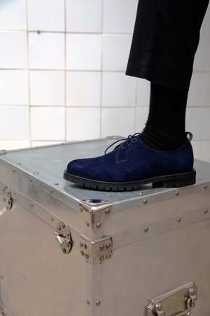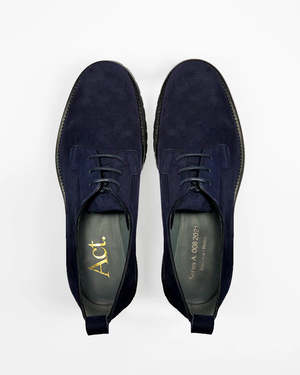 Sizing: We offer whole sizes only. If you are a half size we recommend to size one down for this style. Polished calfskin mens derby shoes in suede marine. Tonal lace-up closure & textured rubber sole. Pull-loop at collar featuring the brands logo2. Cushioned padded leather insole and tonal treaded rubber mid-sole. All of our leather and suede shoes are made by hand with only the best quality fabrics and leathers. Resulting it in small variations in color and details, that makes each of Act Series items so unique.