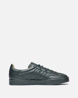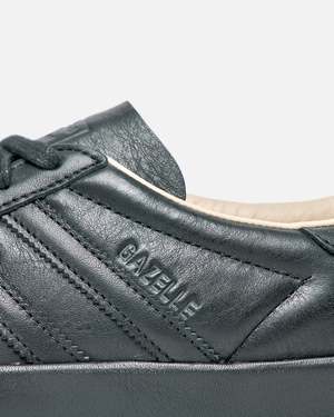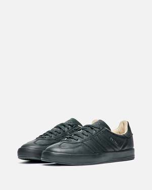 Adidas Gazelle Indoor Lux in Black. This low-top sneaker features a tonal leather paneled upper. Branding is embossed on the tongue, lateral sides and heel counter. Key features include a leather paneled upper, leather serrated three stripes, leather wrap midsole, and rubber outsole.