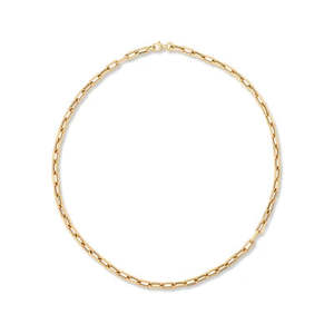 Chain with 5.3mm gauge and hollow links to keep the heavy looking chain feather light. 18" length is the shorter of the two chain necklaces seen on the models in the photographs. 14K Yellow Gold.