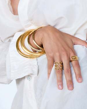 The Double Line Ring features a fluid design and is crafted from 18 karat responsible gold plated recycled brass. The ring can be adjusted due to its shape and is available in either a high polish or satin, slightly matte finish. Materials & Information: - 18 karat responsible gold plated recycled brass - High polish or satin finish - Band backside: 6mm - Total width: 10.5mm