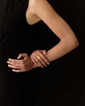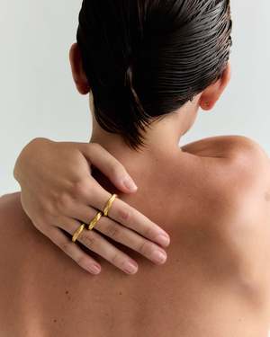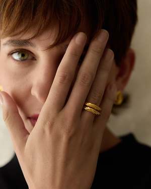 The FIXED ROLLER 5 ring is made in 18 karat gold plated recycled brass. This ring contains five golden bands that are fixed into one band together. A classical ring with a modern elegant twist. The FIXED ROLLER 5 ring comes in a high or satin polish. Materials & information: - 18 karat gold plated recycled brass - 5 fixed bands - high or satin polish - diameter 2mm bands Our jewellery is made with RJC - Responsible Jewellery Council certified recycled brass 60% & recycled sterling silver 100%. To find your right fit check the natural ring size chart