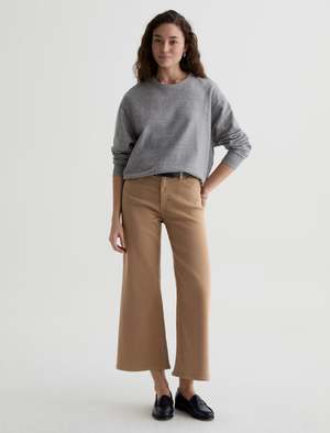 The Saige Wide Leg Crop jean is crafted from AG Cloud Soft Denim, a special left-hand twill construction that gets softer with every wear. This mid-rise style is adored for its easy, relaxed silhouette and cropped leg, and is designed in the khaki beige wash, Melange Stone. DESIGNER ID: FSW1D49MLST COLOR: Melange Stone COMPOSITION: 93% cotton, 5% polyester, 2% elastane CARE: Machine wash cold FIT: Runs true to size Front Rise: 10 1/4" Knee Opening: 20 1/4" Bottom Opening: 21" Inseam: 27" Made in the USA.