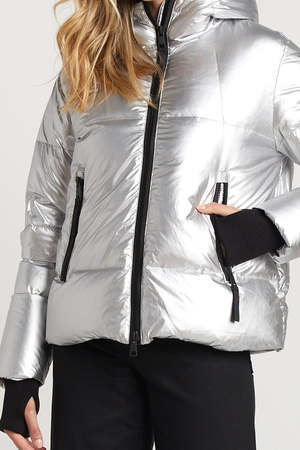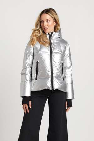 Description: This stand out puffer will keep you warm and cozy this winter. This cruelty-free jacket features a stand out metallic finish with black trim and hood for added warmth. Fabric: Sateen finish, Shell: 100% Nylon, Lining: 100% Nylon, Fill: 90% Down/10% Feathers Measurements: Fit is true to size Length: 24"