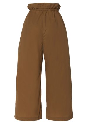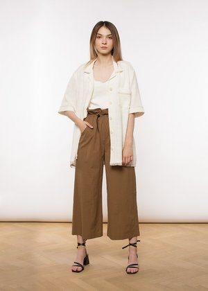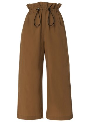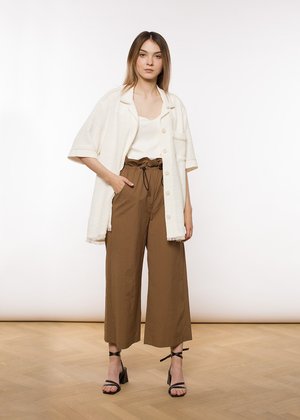 ERON is a Hungarian brand founded by Eszter ron, a designer born into a textile dynasty with generations of tailors. The brands design is characterized by the unique combination of superb quality, innovative craftsmanship, and effortless elegance. Every collectsion focuses on reinventing traditional tailoring techniques while only using the finest materials. Their clothing easily juggles the balance where work and play harmonize together and form the minimal yet feminine sensuality of adecade-defining ERON look. These comfortable pull string waist pant in a beautiful chesnut color are cut form a super light Cotton blend fabric. They are ideal for travelling during the hot summer month and a stroll through your favourite cit. Wear it with a white T-shirt and an oversized shirt as shown here. - Color: chestnut - material: 55% NY , 35% CO, 6% PU - wash at 30 or dry clean Fits true to size. Model is 175 cm (5'8") tall and wears a Size 36 (90 breast/61 waist/90 hips - in cm).