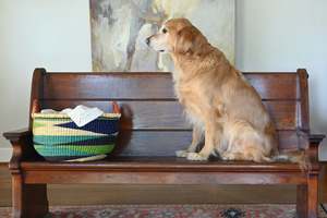 Handwoven by skilled artisans in Bolgatanga, Ghana, this Bolga basket is a new take on a classic design. Skillfully crafted from stiff stalks of elephant grass, Bolga baskets are known for their durability and iconic style. This version features a triangle pattern in natural, shades of green, aqua blue, royal blue, and inky black, with two leather-wrapped handles for added comfort and durability. Because this is a handcrafted item, each piece will vary slightly.