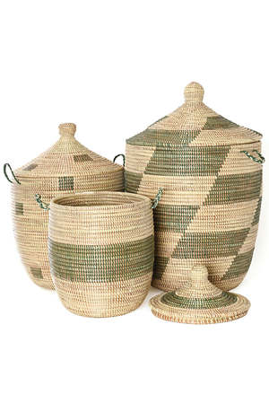 Set of three hampers for storage and organization. These handwoven baskets feature mixed patterns in green and cream. Each hamper in the set nests for compact storage. They are crafted from cattail stalks and plastic. Made in Senegal. Set includes three nesting hampers for versatile storage options. Large hamper dimensions: 18"L x 18"W x 28"H. Medium hamper dimensions: 16"L x 16"W x 22"H. Small hamper dimensions: 13-14"L x 13-14"W x 19-20"H.