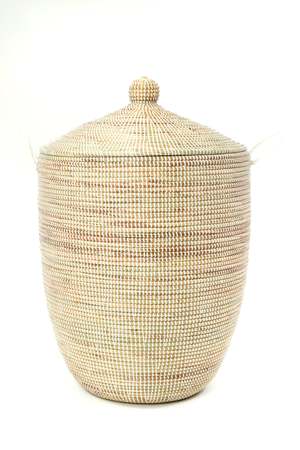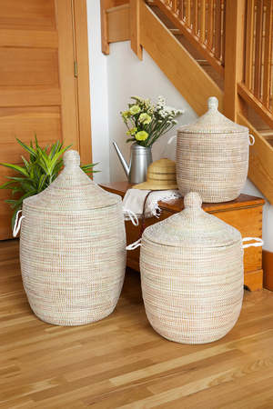 This set includes three handcrafted storage hampers in a solid white finish. Each basket is woven by hand by a Wolof woman in rural Senegal using typha (cattail) stalks and plastic. The collectsion offers three distinct sizes for varied storage needs. Due to the handmade nature of this item, slight variations may occur. Set includes three hampers: Large (18"L x 18"W x 28"H), Medium (16"L x 16"W x 22"H), and Small (1314"L x 1314"W x 1920"H). Crafted from natural typha (cattail) stalks and durable plastic for longevity. Each hamper is individually handmade in Senegal, and the lidded design provides discreet storage for linens, blankets, or laundry.