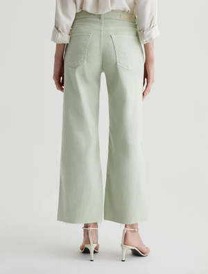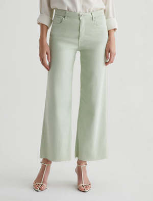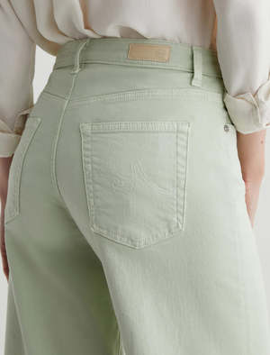 The AG Saige Wide Leg Crop is made with a mid-rise waist and has a relaxed, roomy fit with unfinished edges. In a fresh pistachio hue, these wide-leg jeans for women are crafted from Cloud Soft Stretch Denim, a unique AG material featuring a special left-hand twill weave that becomes even softer with each wear.