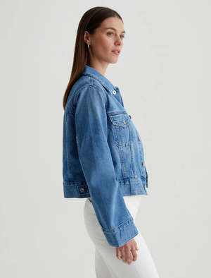 The AG Isa Jacket features a contemporary trucker design with a straight, cropped fit and bell-shaped sleeves. Crafted from 12 oz. Drapey Rigid Denim, it showcases a striking blue wash and timeless elements such as flap pockets, button fastenings, and adjustable back waistband button tabs.