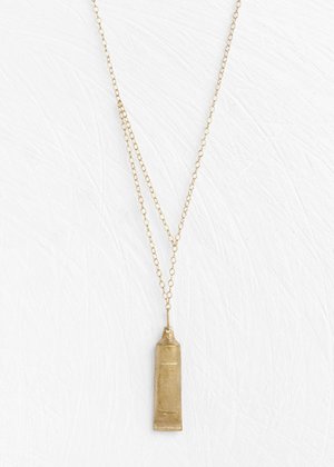 inspired by old branded key-chains, this long necklace features a handmade casted version of a miniature tube metal: 14K + brass chain length: 81cm