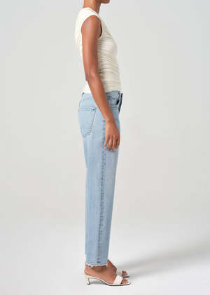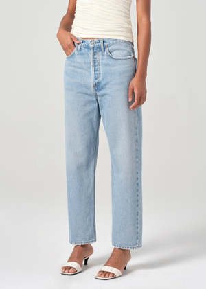 Agolde 90's crop loose jeans in force light denim. The mid-rise fit sits relaxed at the waist, transitioning into a loose, straight leg for a laid-back, effortless silhouette. Made from regenerative cotton in a clean pale indigo wash, these jeans offer a timeless, breathable feel with just the right amount of structure. Button fly. We recommend sizing 1-2 sizes down if you prefer them fitted on your waist. Rise: 12 3/4", inseam: 26", leg opening: 16". 100% regenerative cotton. Made in Turkey with imported materials A173H-1206