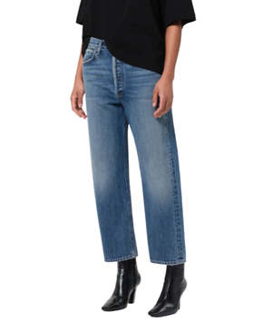 An updated take on a best-selling favorite, the 90s Crop Jean offers a relaxed vintage-inspired fit with a modern cropped inseam. Designed in a medium classic washed indigo, this mid-rise style sits easy at the waist and falls into a loose straight leg for an effortlessly laid-back silhouette. Crafted from non-stretch regenerative cotton denim with a soft hand feel, it provides all-day comfort while maintaining its authentic denim structure. Closure: Button fly Rise: 12 1/2" Inseam: 26" Leg opening: 15 3/4" Model is 5'10" and is wearing a size 27. Fabric: 100% regenerative cotton Care instructions: Machine wash cold inside out with like colors. Do not bleach. Tumble dry low.